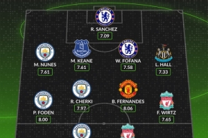 后衛(wèi):努內(nèi)斯(曼城,7.61分)、邁克爾·基恩(埃弗頓,7.61分)、韋斯利·福法納(切爾西,7.58分)、劉易斯·霍爾(紐卡斯?fàn)枺?.33分)
