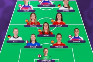 體育資訊7月28日訊 英格蘭女足在本屆歐洲杯決賽點(diǎn)球擊敗西班牙女足,兩隊(duì)也在官方最佳陣容占據(jù)8席。