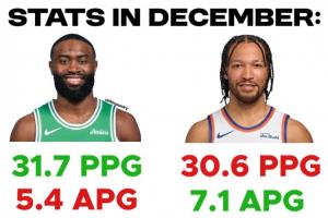 在12月,布倫森場(chǎng)均30.6分7.1助攻,三分命中率40.5%,率隊(duì)取得10勝4負(fù)的戰(zhàn)績(jī)。