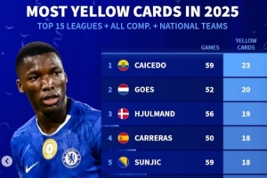 體育資訊1月4日訊 2025年已經(jīng)過去,《轉(zhuǎn)會市場》也統(tǒng)計了前15聯(lián)賽球員的俱樂部+國家隊各項賽事總黃牌次數(shù),凱塞多居首。