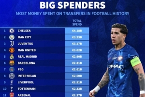 體育資訊7月29日訊 《轉(zhuǎn)會市場》統(tǒng)計了歷史轉(zhuǎn)會費支出情況,切爾西獨自領(lǐng)跑,前11名中英超獨占6席。
