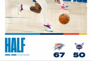 體育資訊1月6日訊 NBA常規(guī)賽,雷霆半場50-67大比分落后黃蜂。