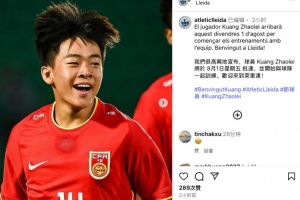 今日該俱樂部在社媒曬出鄺兆鐳身穿國少球衣的照片,并用西語和中文宣布球員將于8月1日抵達(dá)球隊(duì),并將和一線隊(duì)訓(xùn)練比賽。萊里達(dá)競技公告寫道:
