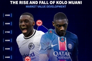 穆阿尼在效力南特時期身價不過1千萬歐元。合同到期免簽加盟法蘭克福后,他的表現(xiàn)非常搶眼,打出46場23球14助攻的驚艷數(shù)據(jù),身價暴漲至8000萬歐元。