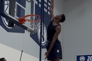 體育資訊7月30日訊 記者Evan Sidery報(bào)道,在最近一次楊百翰大學(xué)的訓(xùn)練中,AJ-迪班薩展示了他超強(qiáng)的彈跳。從圖片中可以看到,迪班薩的垂直彈跳直接讓他的頭完全高出籃筐。