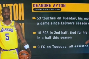 據(jù)統(tǒng)計,在這場比賽中,艾頓全場觸球53次,創(chuàng)下自詹姆斯賽季首秀以來的單場最高紀(jì)錄。