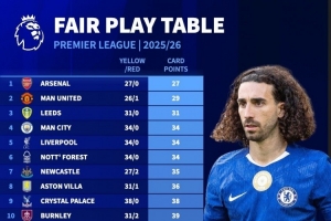 本賽季英超公平競賽積分(積分越少代表吃牌越少)