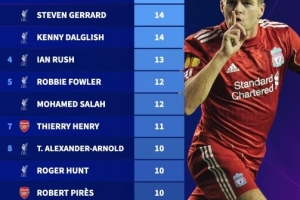 以下為阿森納、利物浦交鋒參與進球數(shù)排行:
