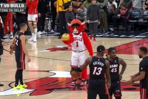 等待期間,熱火球員希羅與公牛吉祥物進(jìn)行半場(chǎng)背投比賽,結(jié)果公牛吉祥物一擊命中,希羅見(jiàn)狀宣布直接退出較量。