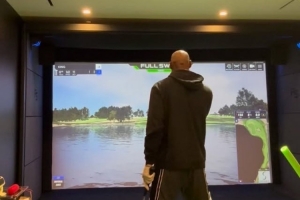 打磨球技!詹姆斯曬在家中玩高爾夫模擬器 揮桿后振臂慶祝