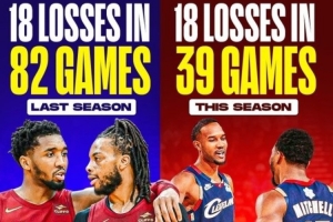 賽季前39場(chǎng),騎士輸?shù)袅?8場(chǎng)。整個(gè)上賽季,球隊(duì)一共只輸了18場(chǎng)。
