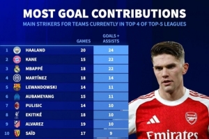 體育資訊1月9日訊 《轉(zhuǎn)會市場》統(tǒng)計了本賽季五大聯(lián)賽排名前四的球隊各自主力中鋒的參與進球情況,哈蘭德、凱恩、姆巴佩分列前三,戴維、約克雷斯、貢薩洛·拉莫斯列倒數(shù)前三。