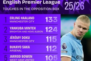 本賽季英超對(duì)方禁區(qū)觸球榜:哈蘭德居首,多庫、薩卡、薩拉赫在列