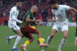 比賽第68分鐘,姆伯莫帶球突入禁區(qū)后痛苦倒地,裁判沒有判給喀麥隆隊點球,回放來看,摩洛哥球員與姆伯莫的右腿有一個接觸。