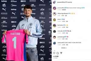 特拉福德曬出自己手持曼城1號(hào)球衣的簽約亮相照,并配文:“回到了我所屬的家?!?/p>