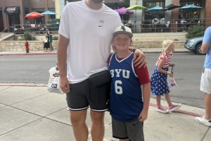 體育資訊7月6日訊 一對父子偶遇了爵士球員努爾基奇,努爾基奇還友好的和小球迷合影留念。