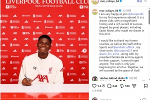 體育資訊1月10日訊 塞內(nèi)加爾18歲中衛(wèi)恩迪亞耶更新社媒動(dòng)態(tài),曬出與利物浦簽約的照片,