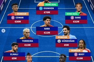 前鋒:科曼(拜仁,3000萬)、奧斯梅恩(那不勒斯,7000萬)、薩內(nèi)(拜仁,3200萬)
