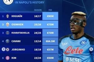 體育資訊7月31日訊 奧斯梅恩轉會加拉塔薩雷只待官宣,《轉會市場》也統(tǒng)計了那不勒斯隊史最貴賣人情況,伊瓜因仍居首。