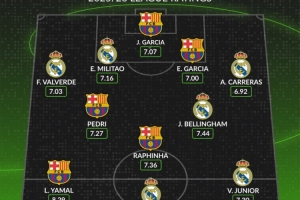 體育資訊1月11日訊 皇馬和巴薩將在本輪西超杯狹路相逢,whoscored也統(tǒng)計(jì)了兩隊(duì)本賽季西甲評(píng)分合體最佳陣,亞馬爾、姆巴佩領(lǐng)銜。