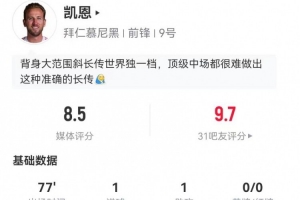 體育資訊1月12日訊 拜仁在本輪德甲7-1領(lǐng)先狼堡,凱恩本場(chǎng)數(shù)據(jù)如下: