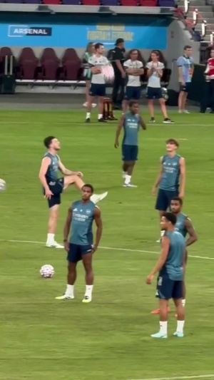 訓練中,賴斯向小將道曼展示了一下屁股顛球,隨后道曼準備模仿時,阿爾特塔路過伸手打斷了道曼的動作。