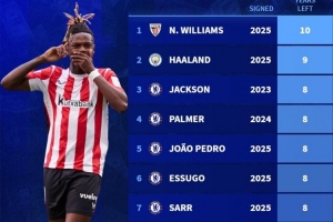 體育資訊7月6日訊 德國轉(zhuǎn)會市場列出了目前球員最長合同排名,尼科-威廉姆斯10年居首,哈蘭德9年次席,前10切爾西占7席。