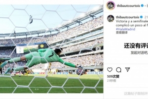 庫爾圖瓦社媒曬出撲救的照片,配文:“取勝并晉級半決賽!最后時刻有點(diǎn)棘手,但…????Hala Madrid”