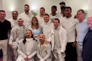 湖人新老板馬克-沃爾特(右一)和珍妮-巴斯帶著盧卡-東契奇和他的幾名隊友前往拉斯維加斯參加后街男孩的演唱會,慶祝他續(xù)約成功。