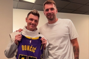 后街男孩(圖中為Nick Carter)獲贈(zèng)東契奇的簽名球衣,并合影留念。