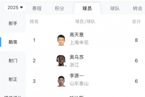 在本輪貢獻(xiàn)1傳1射后,連續(xù)5輪聯(lián)賽送助攻的申花中場高天意的助攻數(shù)來到8個(gè),繼續(xù)領(lǐng)跑助攻榜,奧烏蘇、李源一則以6次助攻并列排在第二位。