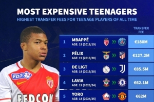 體育資訊8月5日訊 德國轉(zhuǎn)會市場統(tǒng)計(jì)了足壇歷史U20球員(不包含20歲)的轉(zhuǎn)會費(fèi),并列出榜單,姆巴佩、菲利克斯、德里赫特排名前三。