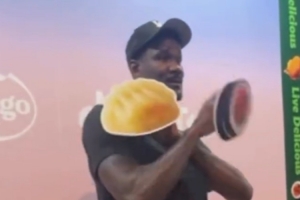 活動(dòng)現(xiàn)場(chǎng),艾頓盡情展現(xiàn)搞怪一面,拿著贊助商產(chǎn)品手牌花式應(yīng)援。