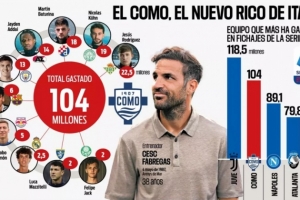 體育資訊8月6日訊 據(jù)西媒《阿斯報(bào)》發(fā)文表示,法布雷加斯執(zhí)教的科莫今夏已經(jīng)花費(fèi)1.04億歐簽下10名新球員,轉(zhuǎn)會支出僅次于尤文,位列意甲第二多。在印尼富豪的支持下,科莫正在成為意甲的一支重要力量。