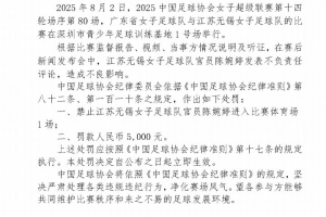 體育資訊8月8日訊 中國足協(xié)官方消息,對江蘇女足主教練陳婉婷停賽1場罰款5000元。