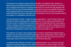體育資訊08月09日訊 特爾施特根近日被巴薩暫時(shí)剝奪隊(duì)長(zhǎng)袖標(biāo),球員發(fā)表聲明,對(duì)近期的事情做出回應(yīng)。