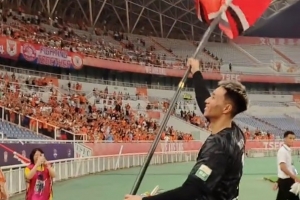 賽后,于金永來到場邊,揮舞著旗幟與主場球迷一起互動。