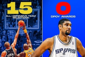鄧肯生涯15次入選最佳防守陣容,但從未拿過(guò)年度最佳防守球員,本-華萊士拿過(guò)4次。