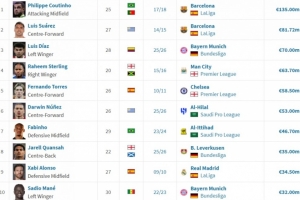 1.庫(kù)蒂尼奧 25歲 17/18賽季 賣給巴薩 1.35億歐