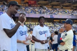 視頻中,三人身穿美國職業(yè)棒球大聯(lián)盟(MLB)球隊洛杉磯道奇的球衣,來到道奇的主場參加活動。