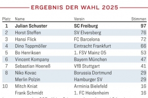 體育資訊8月11日訊 弗賴堡主帥舒斯特爾當(dāng)選2025年德國(guó)最佳教練,《踢球者》公布得票詳情,舒斯特爾97票居首,斯蒂芬、弗里克二三位。