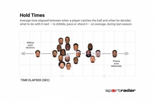 體育資訊8月11日訊?數據專家Todd Whitehead統(tǒng)計了上賽季,進攻發(fā)起者在接到球之后,做出下一步行動(運球、傳球或投籃)所用的平均時間,具體如圖。