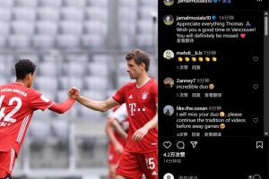 穆西亞拉社媒寫道:感謝你所做的一切托馬斯????祝你在溫哥華一切順利,一定會想念你的??
