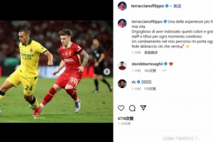泰拉恰諾寫道:“這是我人生中最重要、最有成長意義的經(jīng)歷之一。能夠穿上這身球衣,我感到無比自豪;感謝所有隊友、教練組以及球迷們,感謝與你們共同度過的每一個時刻?!?/p>