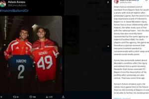 阿茲努和阿什拉夫均來自摩洛哥,兩人是國家隊隊友,后者不僅是拜仁小將的偶像,在國家隊也很照顧他。最近,阿茲努和阿什拉夫還簽約同一家經(jīng)紀(jì)公司Footfeel ISM。因此,對于兩位球員和經(jīng)紀(jì)公司來說,這場比賽創(chuàng)造了一個特別的時刻,大家都希望通過交換球衣并在社交媒體上發(fā)布照片來紀(jì)念。