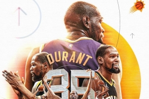 太陽官方曬圖致謝杜蘭特寫道:“謝謝你,KD?!?/p>