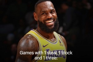 NBA歷史上僅有三位球員至少有350場(chǎng)常規(guī)賽單場(chǎng)砍下至少1蓋帽+1搶斷+1三分,他們分別是:詹姆斯(464)、杜蘭特(397)和哈登(361)。