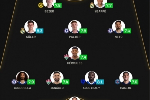 中場(chǎng):居勒爾(皇馬,8.3分)、帕爾默(切爾西,7.8分)、赫克勒斯(弗魯米嫩塞,7.4分)、內(nèi)托(切爾西,7.4分)