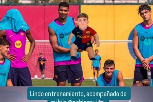 照片中,阿勞霍和隊友合影,手中P上了嬰兒加維,并寫道:“美好的訓(xùn)練時光,有兒子相伴左右?!?/p>
