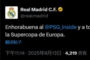 皇馬官方寫道:“祝賀巴黎圣日爾曼以及其所有的球迷,恭喜你們贏得實至名歸的歐洲超級杯冠軍?!?/p>